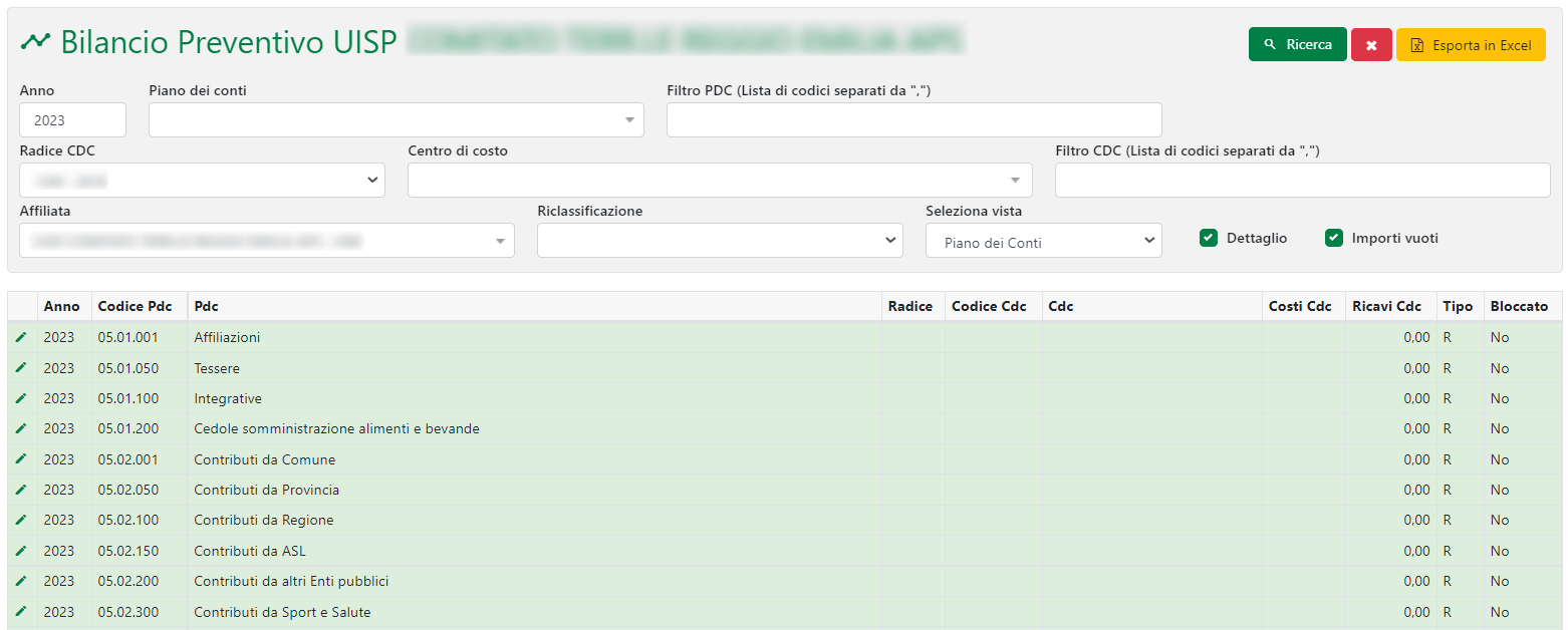 Cliccando sul pulsante “Esporta in Excel” si potrà esportare il bilancio preventivo corrente in un file Excel.