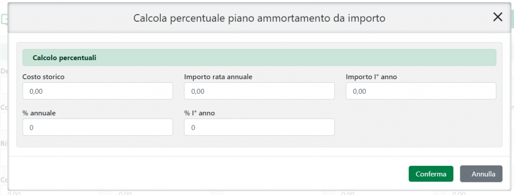 Cliccando sul pulsante “Piano ammortamento” potrai calcolare la percentuale da importo.