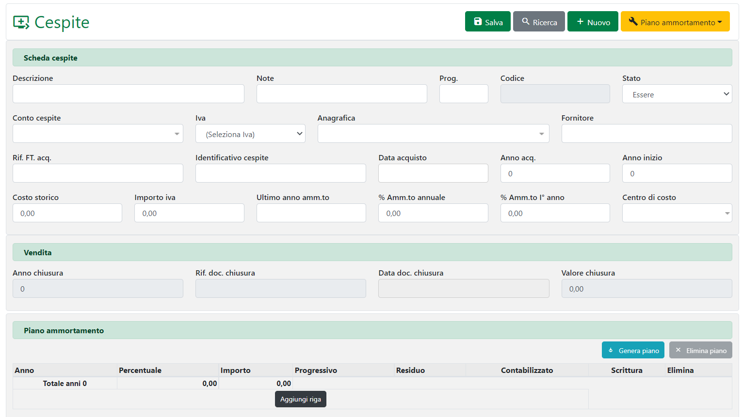 In questa sezione potrai creare un nuovo cespite utilizzando le varie maschere sottostanti. Cliccando sul pulsante “Salva” si potrà salvare correttamente il cespite in questione.