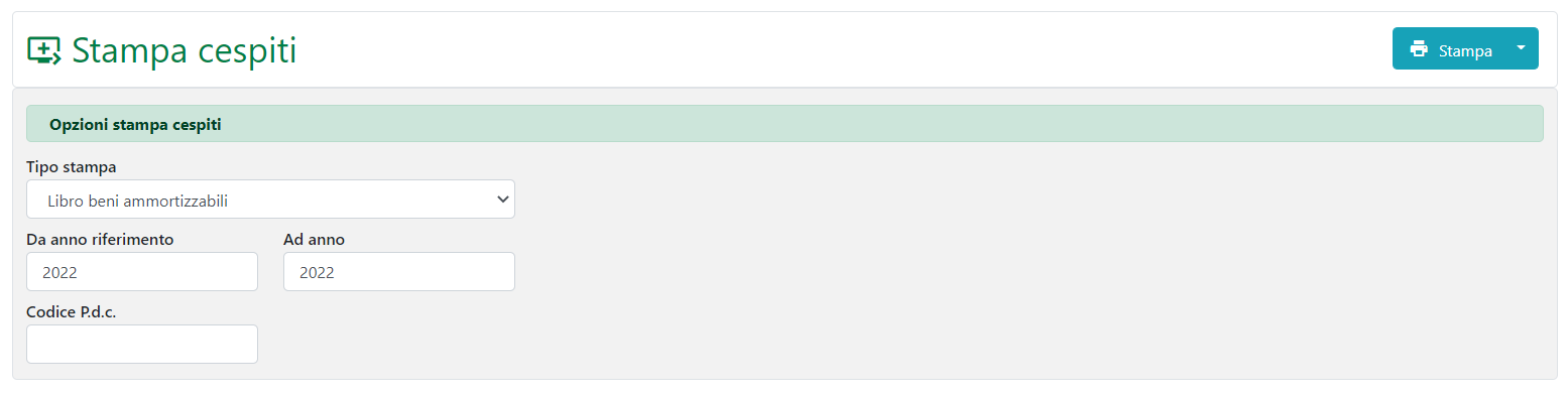 In questa sezione potrai stampare il resoconto cespiti in un file PDF o Excel. Il contenuto si può filtrare per tipo di stampa, da anno di riferimento ad anno e per codice P.d.c.