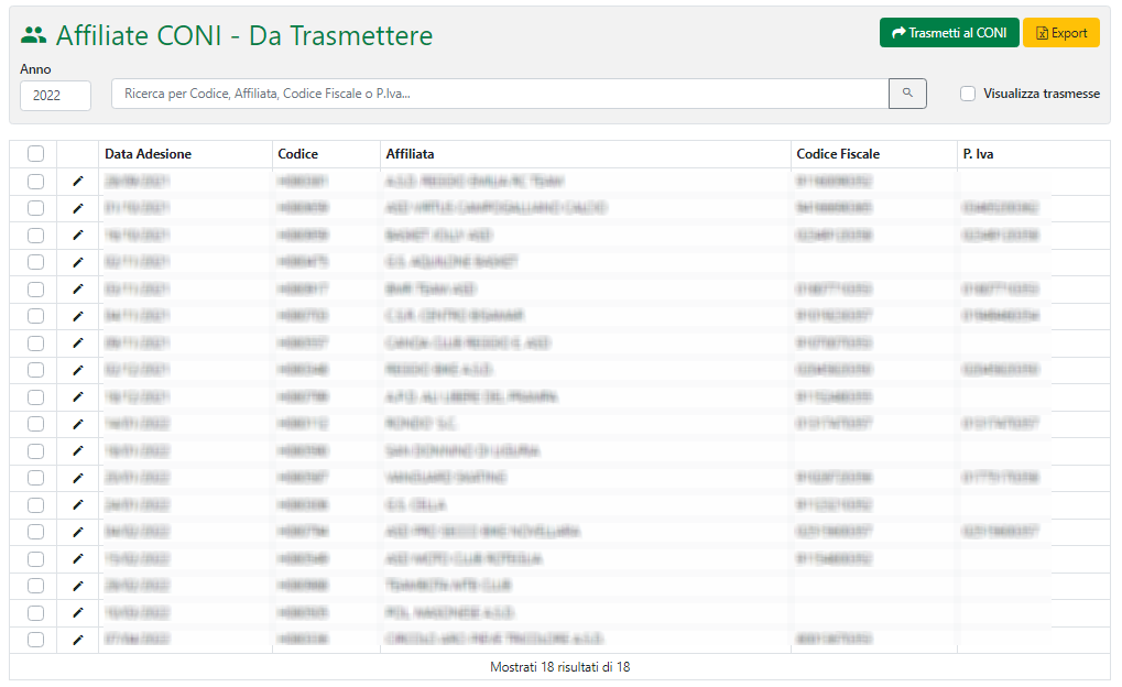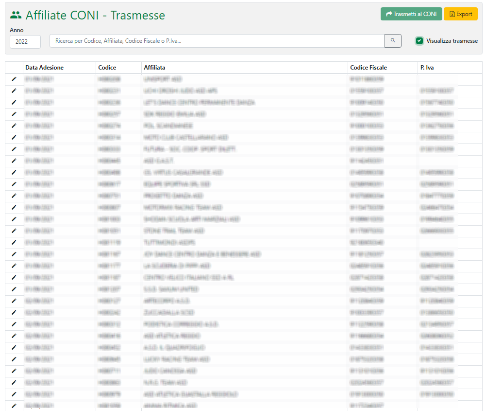 All’interno di questa sezione è possibile visualizzare, sotto forma di griglia, la lista delle società da trasmettere al CONI. Cliccare su edit della società desiderata per accedere alla sua schermata di modifica. Il contenuto si può filtrare per anno, codice, affiliata, codice fiscale e per partita IVA.