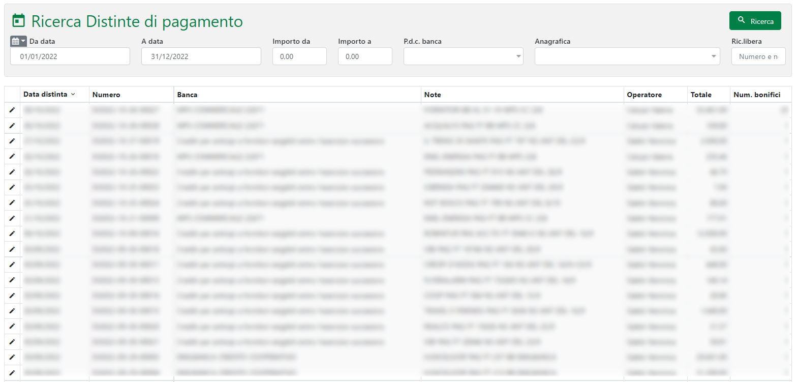In questa sezione si potrà ricercare le distinte di pagamento. Cliccando la seguente icona edit si potrà modificare la riga in questione. Il contenuto si può filtrare utilizzando la maschera sottostante. Il risultato verrà visualizzato sotto forma di griglia cliccando l’apposito pulsante.