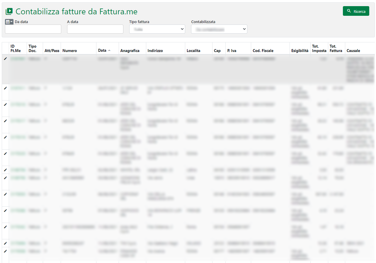 All’interno di questa sezione è possibile ricercare, secondo i campi presenti le fatture dal software Fattura.me. La ricerca comparirà sotto forma di griglia scrollabile da sinistra verso destra al termine della quale sarà possibile vedere se la fattura è stata contabilizzata o meno. Cliccando su edit per ogni riga è possibile aprire la corrispondente schermata per contabilizzare la fattura. Gli ID della fattura risultano cliccabili e rimandano all’apposita sezione del software stesso.