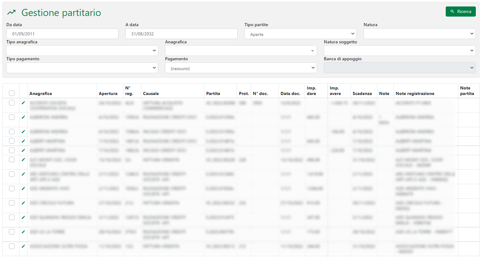 All’interno di questa sezione è possibile ricercare, consultare e gestire tutte le operazioni finanziare effettuate. La ricerca, filtrabile secondo i campi presenti comparirà sotto forma di griglia. Per ogni riga della griglia è presente l’icona edit tramite la quale è possibile accedere alla schermata di visualizzazione e modifica della ricevuta corrispondente.