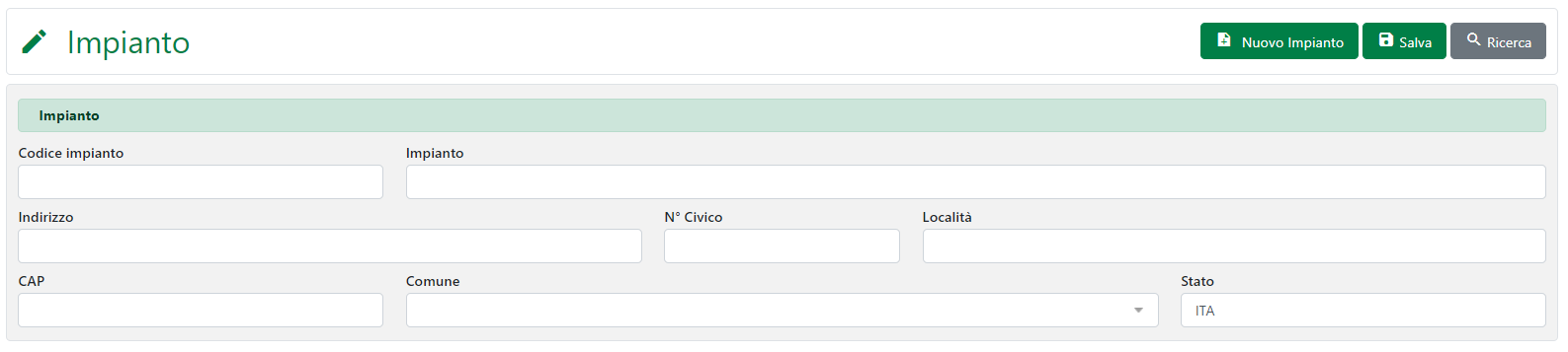 In questa sezione si potrà creare un nuovo impianto inserendo il codice impianto, l’impianto, l’indirizzo, il numero, la località, il CAP, il comune e lo stato. Finito di inserire i vari dati cliccando sul pulsante “Salva” si potrà creare correttamente un nuovo impianto.