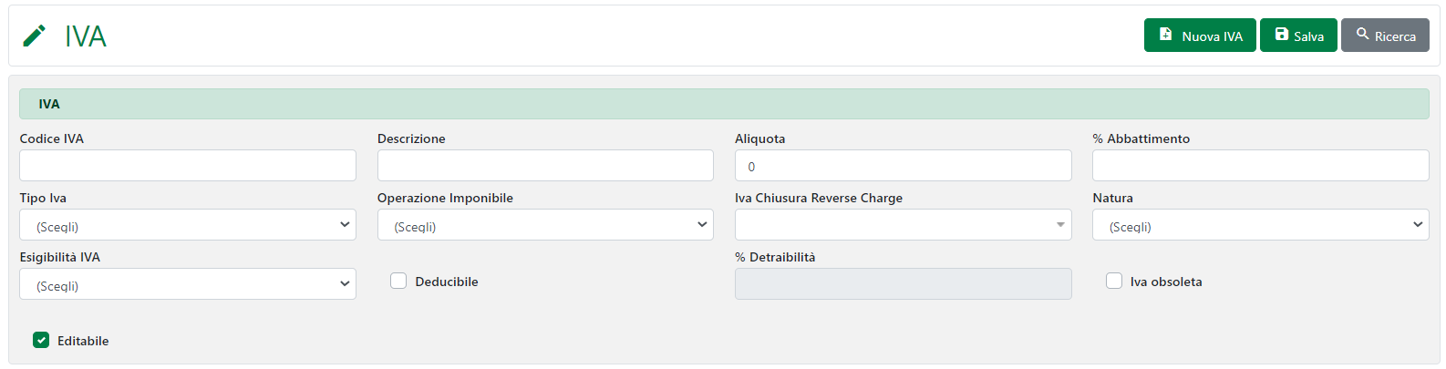 In questa sezione potrai creare una nuova IVA. Cliccando sul pulsante “Salva” si potrà aggiungere correttamente l’oggetto in questione.