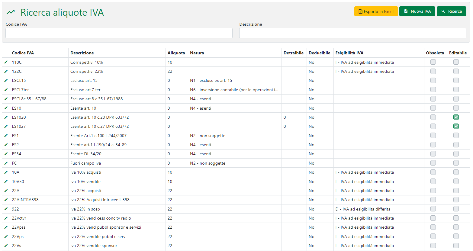 All’interno di questa sezione è possibile effettuare la ricerca delle aliquote IVA, filtrabile secondo i campi presenti. Quest’ultima comparirà sotto forma di griglia. Per ogni riga della griglia è presente l’icona edit cliccando sulla quale sarà possibile accedere alla schermata di visualizzazione e modifica dell’aliquota corrispondente.