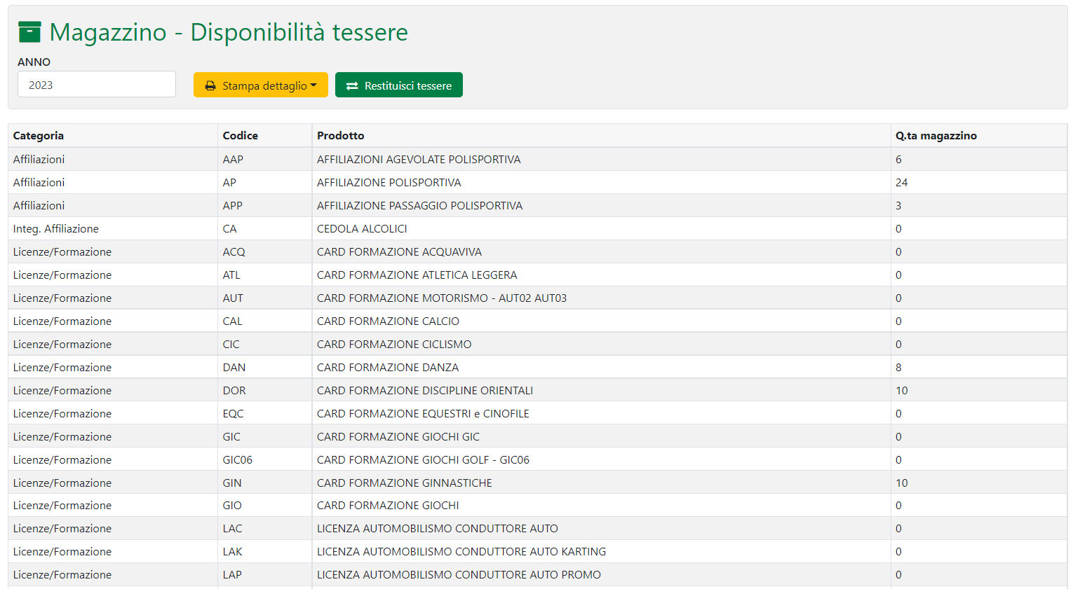 In questa sezione è possibile visualizzare la quantità di tessere disponibili sotto forma di griglia all’interno della quale possiamo visualizzare i seguenti valori: categoria, codice, prodotto e quantità in magazzino. Il contenuto si può filtrare per anno.