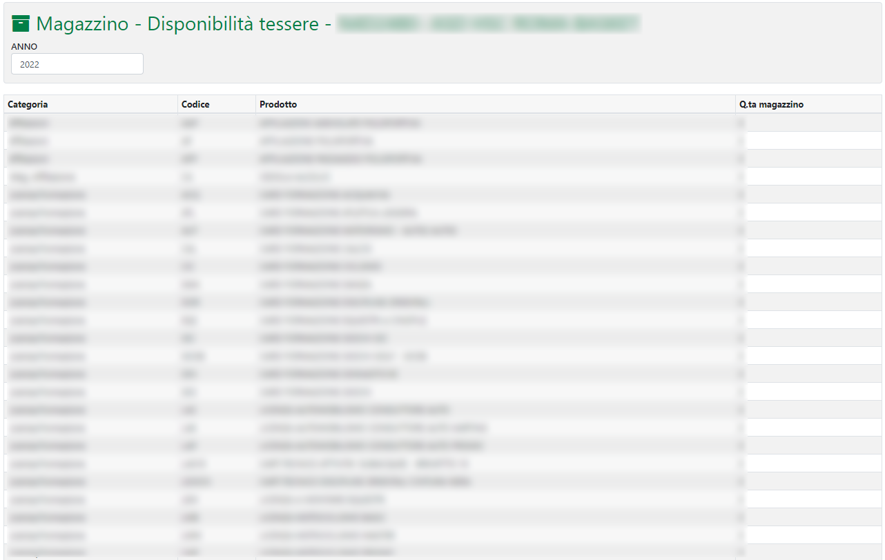 In questa sezione è possibile visualizzare la disponibilità delle tessere per una determinata società. I dati compariranno sotto forma di griglia nella quale verranno visualizzati la tipologia di tessera, il relativo codice, il tipo di prodotto e la quantità disponibile.