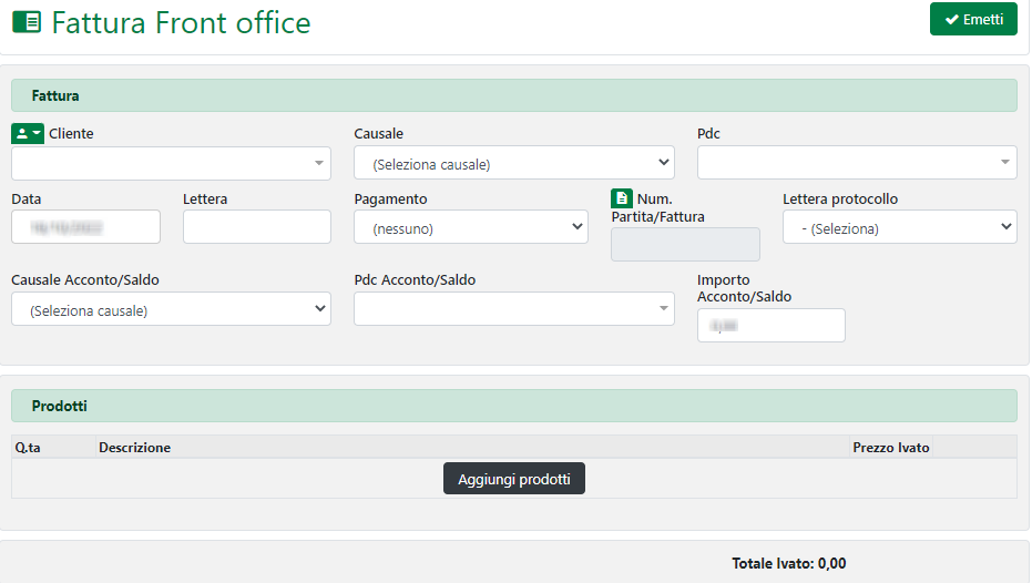 All’interno di questa sezione è possibile effettuare l’emissione di una fattura tramite la compilazione dei campi presenti.