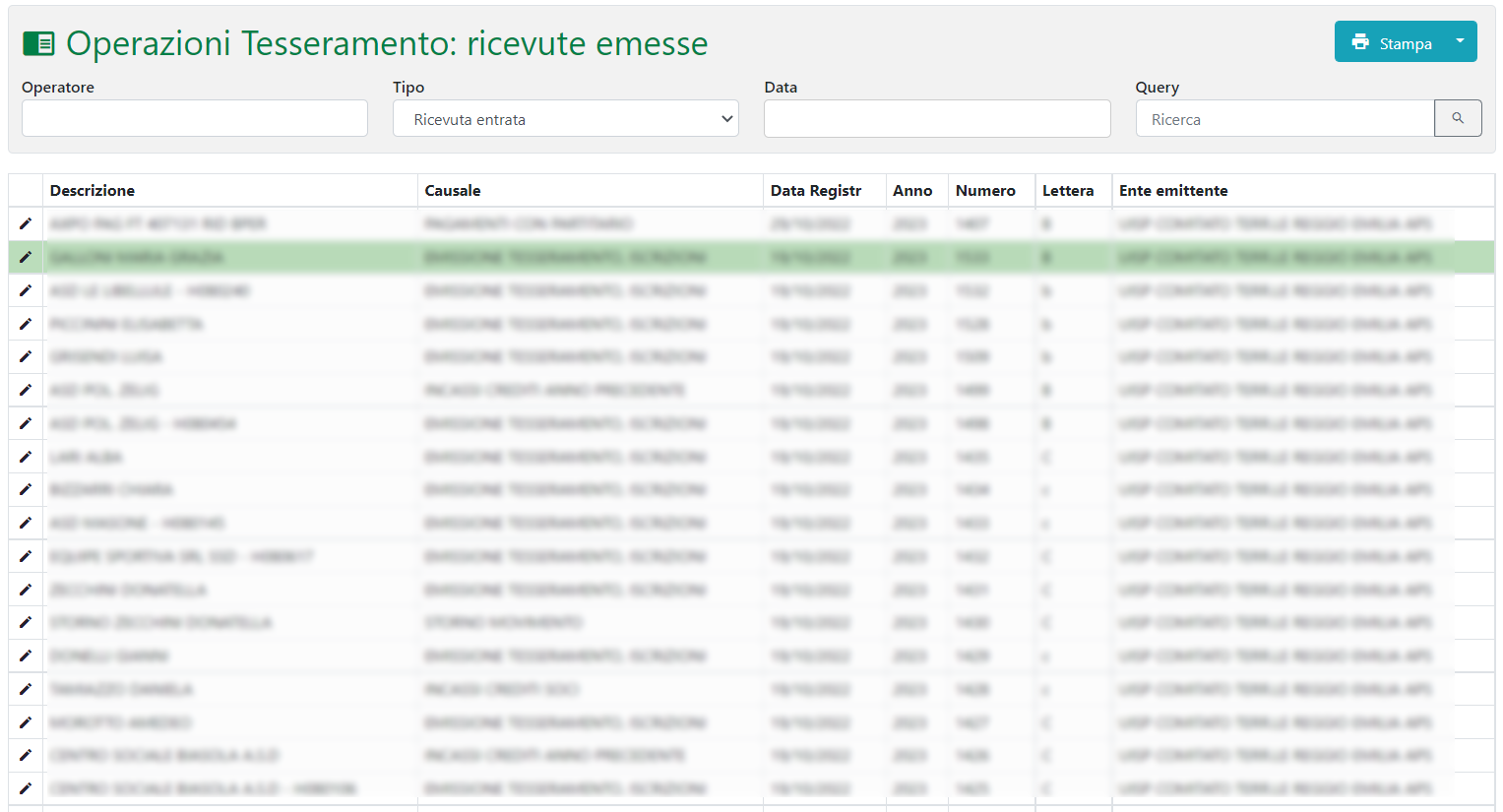 All’interno di questa sezione sarà possibile effettuare la ricerca delle ricevute emesse filtrabili secondo i campi presenti. La ricerca comparirà sotto forma di griglia. Cliccando su edit per la ricevuta desiderata sarà possibile accedere alla relativa sezione di visualizzazione e modifica.