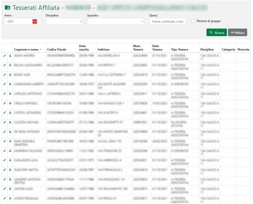 All’interno di questa sezione sarà possibile visualizzare e ricercare tutti i tesserati relativi alla società selezionata. Il risultato verrà visualizzato sotto forma di griglia all’interno della quale ci saranno i relativi dati: cognome e nome, codice fiscale, data nascita, indirizzo, numero tessera, data tessera, tipo tessera, disciplina, categoria e ricevuta. Per ricercare correttamente il contenuto si potrà utilizzare la maschera sottostante per filtrare, in seguito cliccare il pulsante “Ricerca”.