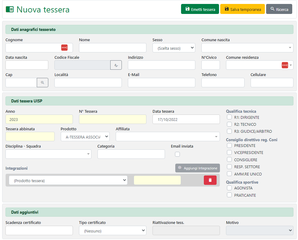 All’interno di questa sezione è possibile creare una nuova tessera