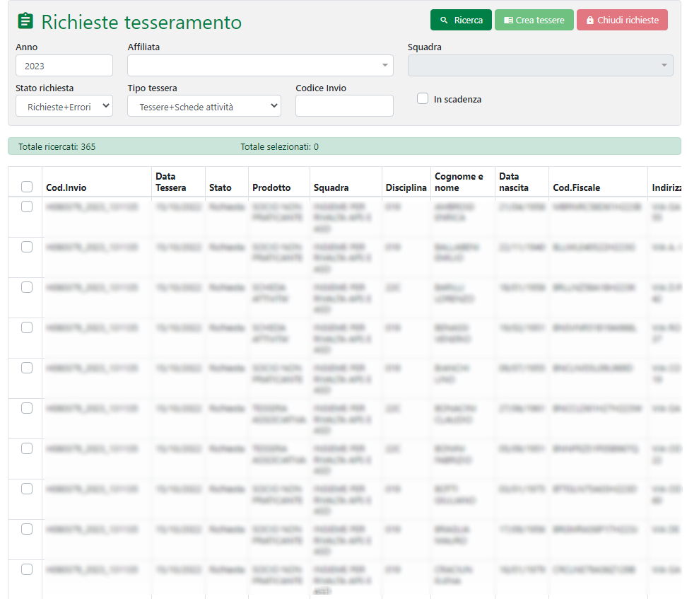 All’interno di questa sezione è possibile visualizzare e ricercare le richieste di tesseramento, effettuarne la creazione o all’occorrenza chiuderle. Il risultato verrà visualizzato sotto forma di griglia e potrà essere filtrato attraverso la maschera sottostante.