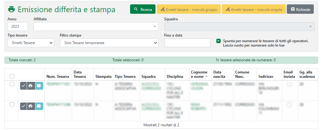 In questa sezione è possibile ricercare ed effettuare la stampa delle tessere selezionate. Il risultato verrà visualizzato sotto forma di griglia e si può filtrare attraverso la maschera sottostante.