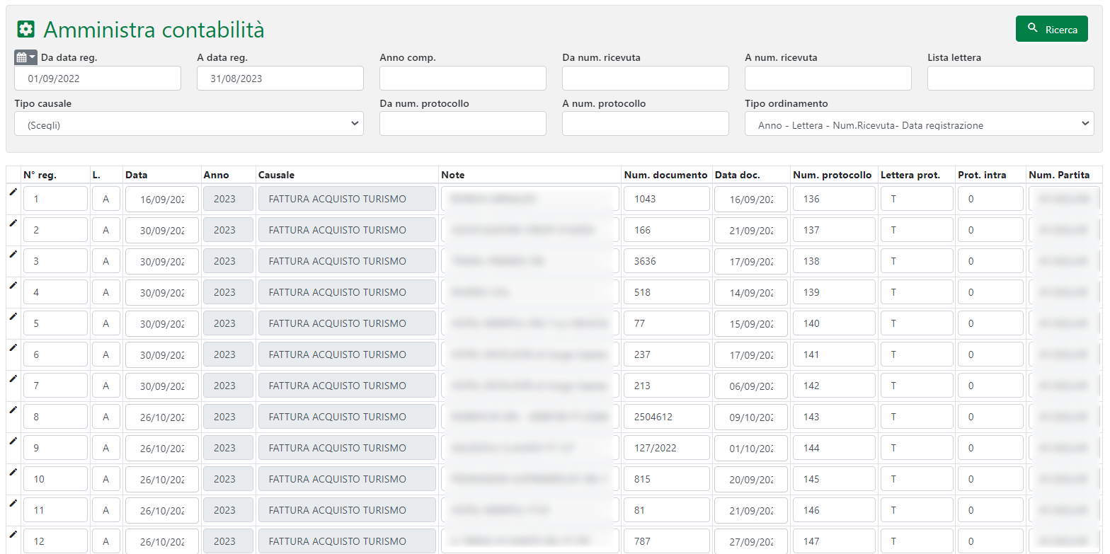 In questa sezione si potrà ricercare e amministrare la contabilità, filtrando attraverso la maschera seguente e cliccando il pulsante “Ricerca”. Il risultato verrà visualizzato sotto forma di griglia. Cliccando la seguente icona edit si potrà modificare l’elemento in questione.
