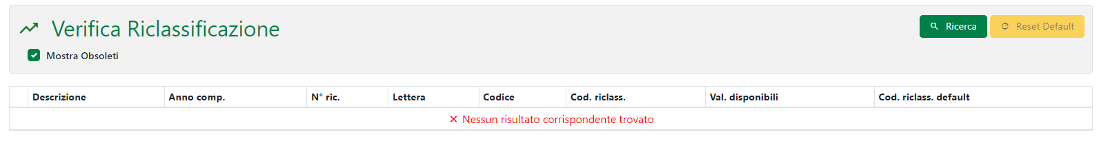 In questa sezione si potrà effettuare una verifica della riclassificazione cliccando sul pulsante “Ricerca”. Il risultato verrà visualizzato sotto forma di griglia all’interno della quale si potrà visualizzare la descrizione, l’anno, il numero ricevuta, la lettera, il codice, il codice riclassificazione, i valori disponibili e il codice riclassificazione di default.